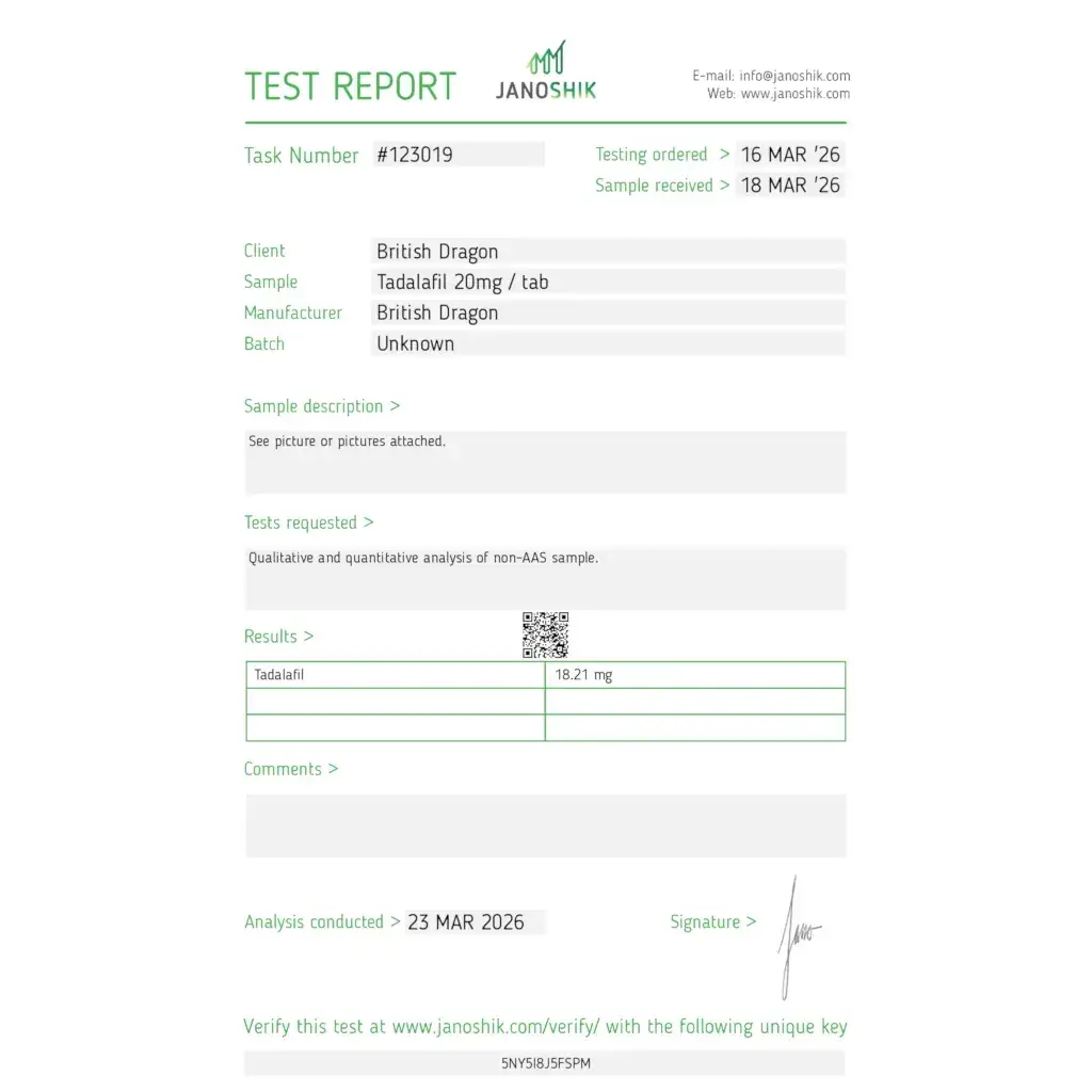 Drug Class: PDE5 Inhibitor Active Ingredient: Tadalafil Citrate Dosage: 20 mg/pill Manufacturer: British Dragon Routes of Administration: By Mouth
