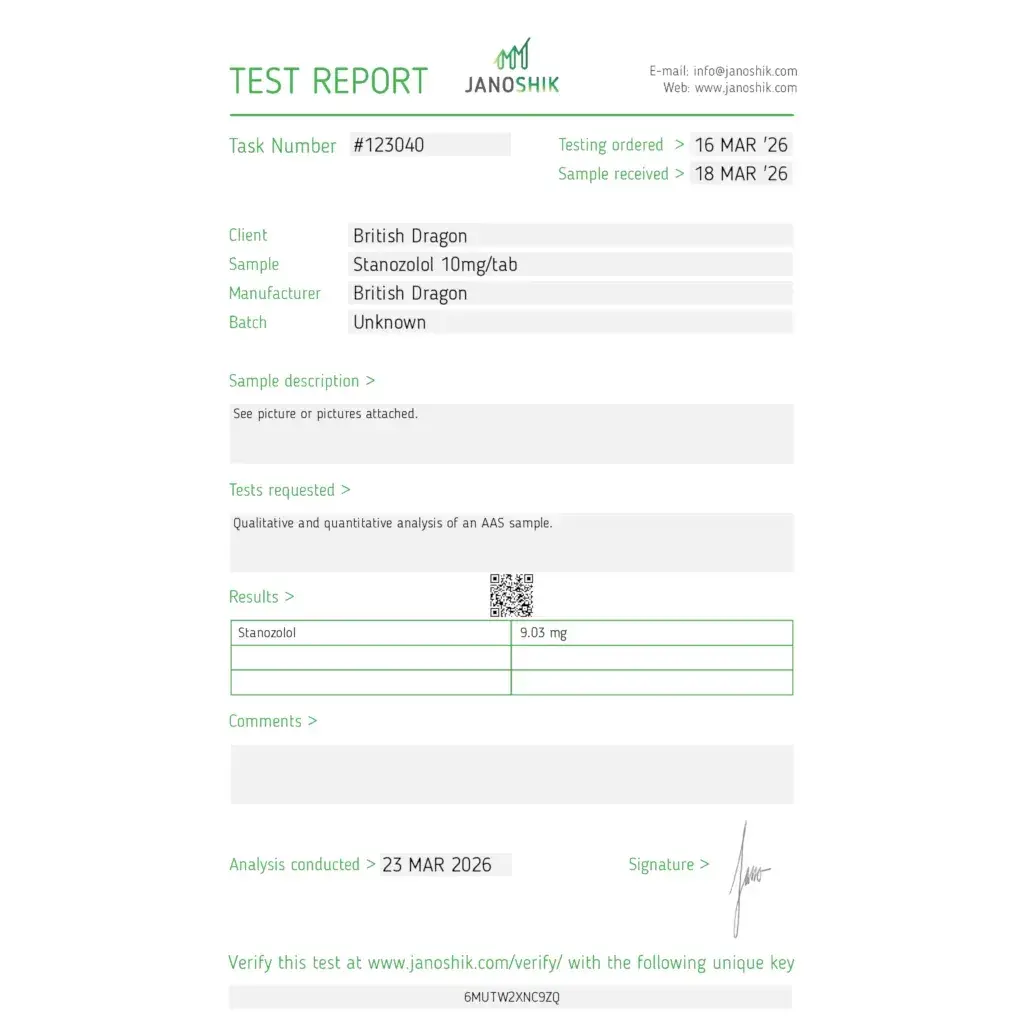Drug Class: Androgen; Anabolic Steroid Active Ingredient: Stanozolol Dosage: 50 mg/pill Manufacturer: British Dragon Routes of Administration: By Mouth